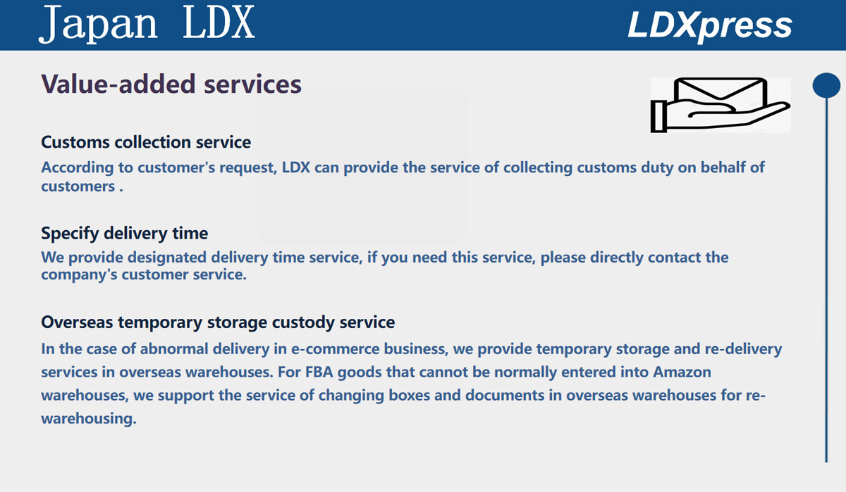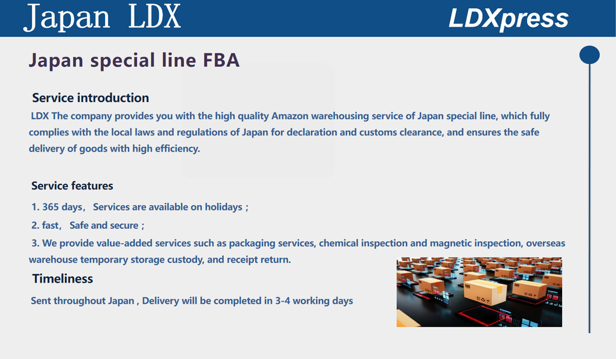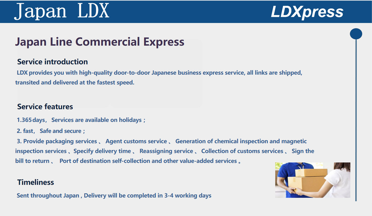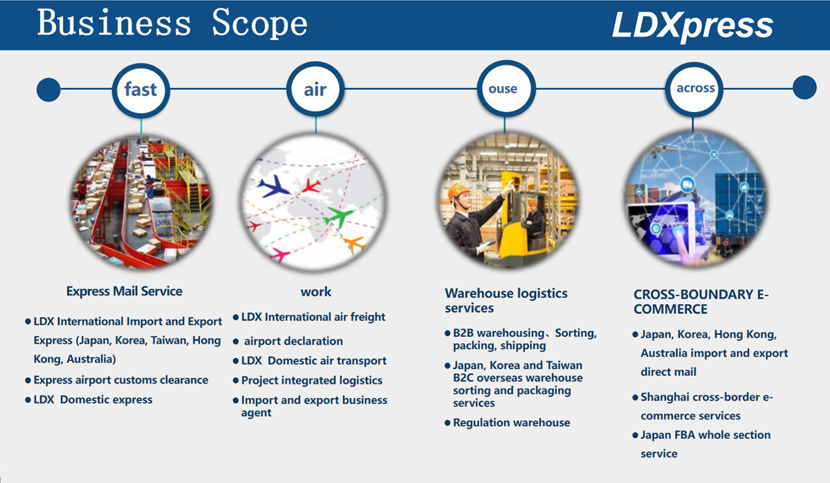 Established in 1997, LDX focus on the international express import and export agency business ( Japan  Korea Taiwan Hong Kong Australia ), which includes  express airport customs declaration and supervision warehouse, domestic air transport ,comprehensive logistics , B2B warehousing, sorting and packaging, transport, direct services  for cross-border e-commerce,FBA segmental service in Japan, Korea, Australia e-commerce small package import and export customs clearance service.